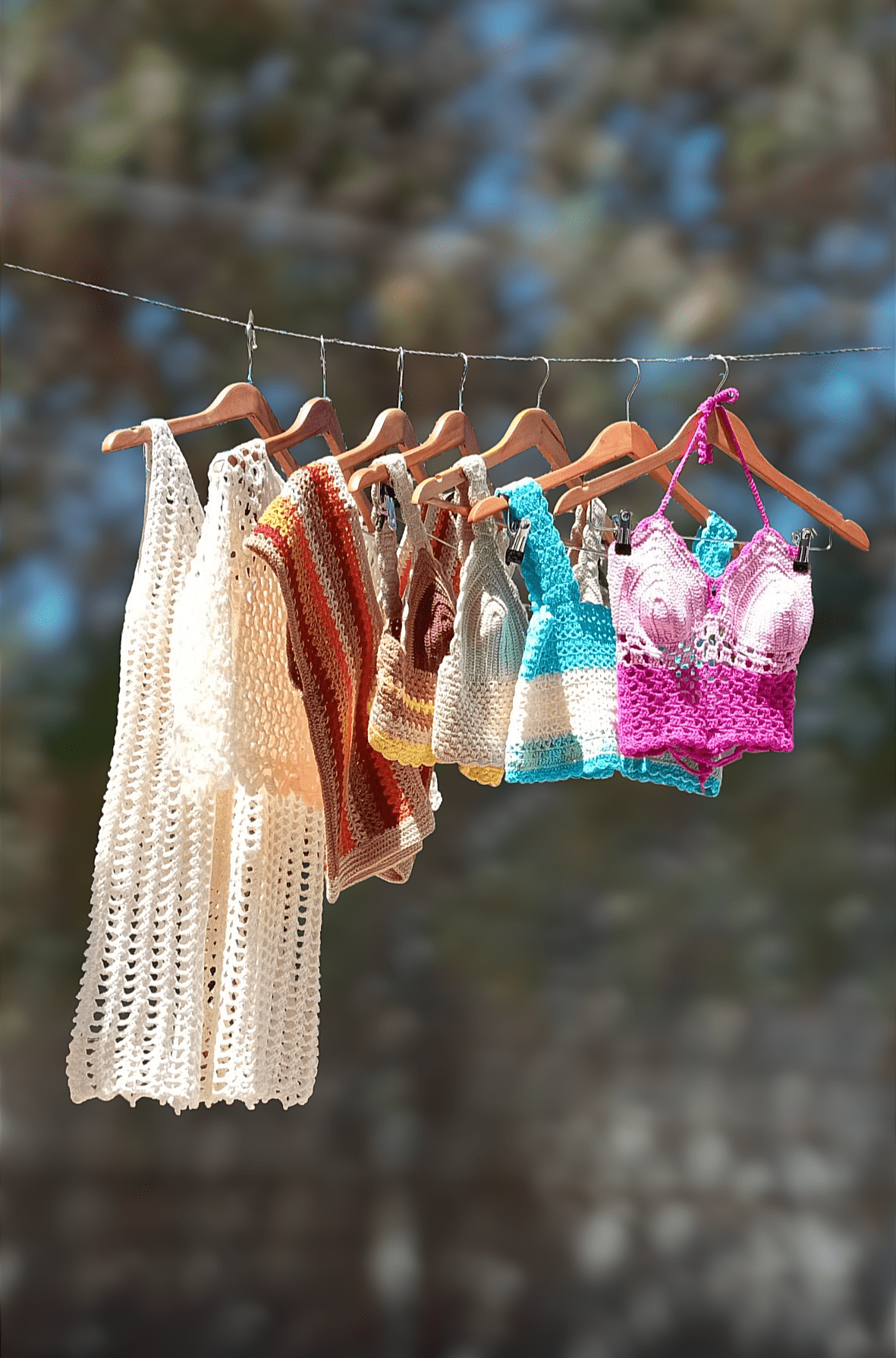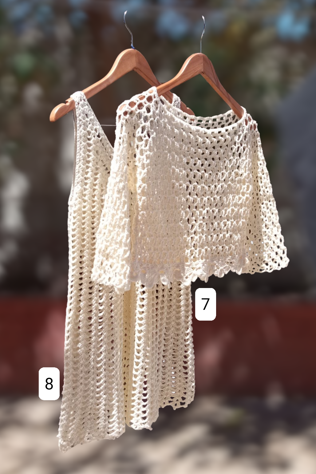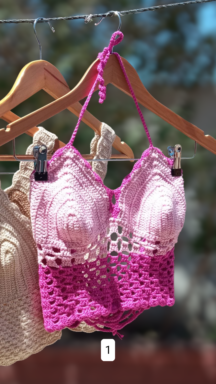 Cada una de estas piezas, tops a crochet, chalecos, vestidos, bolsos tejidos y paños decorativos, está hecha completamente a mano por una artesana chilena que encontró en el tejido una forma de volver a crear belleza, calma y sentido en su día a día.
